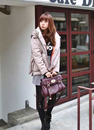 卡其色羽高档办公室工作服绒服+黑色字母卫衣+格纹伞裙+黑色天津宝洁公司工作服丝袜+黑色短靴+枣红色手提包